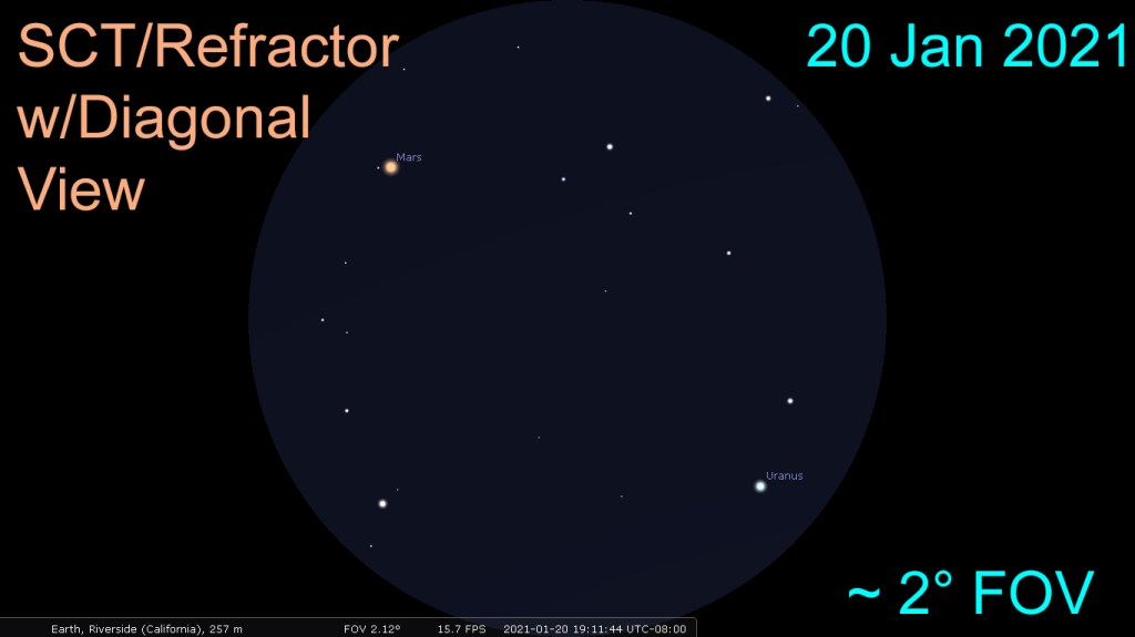 While they won’t be anywhere near close to meeting each other at the level we just saw Jupiter and Saturn back in December, this will be a good night to bring out the binoculars or a wide field telescope to check out all three objects near each other in the sky! If you can spot Mars and the Moon, then you can easily look for the elusive planet Uranus which will be nearly in line between the two.