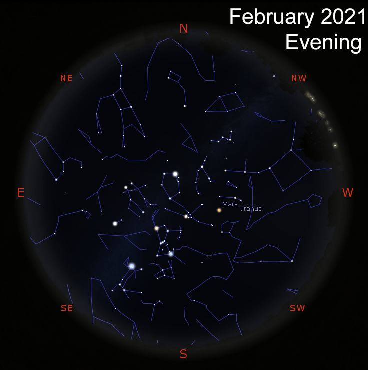If you don’t care about that and just want to know what planets will be visible, Mars will be your only naked eye planet visible in the evening sky. In late February, you can glimpse Jupiter, Saturn, and Mercury emerging from the Sun’s glare for a short window before sunrise. Venus will be largely lost to the Sun’s glare this month, and the only way to see it will be with careful optical aid.