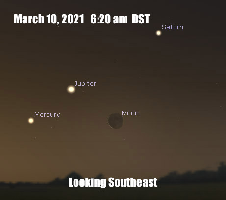 Mercury will be visible with Jupiter and Saturn early in the month before it goes back to getting too close the Sun’s glare. Venus will be lost in the Sun’s glare throughout the month of March.