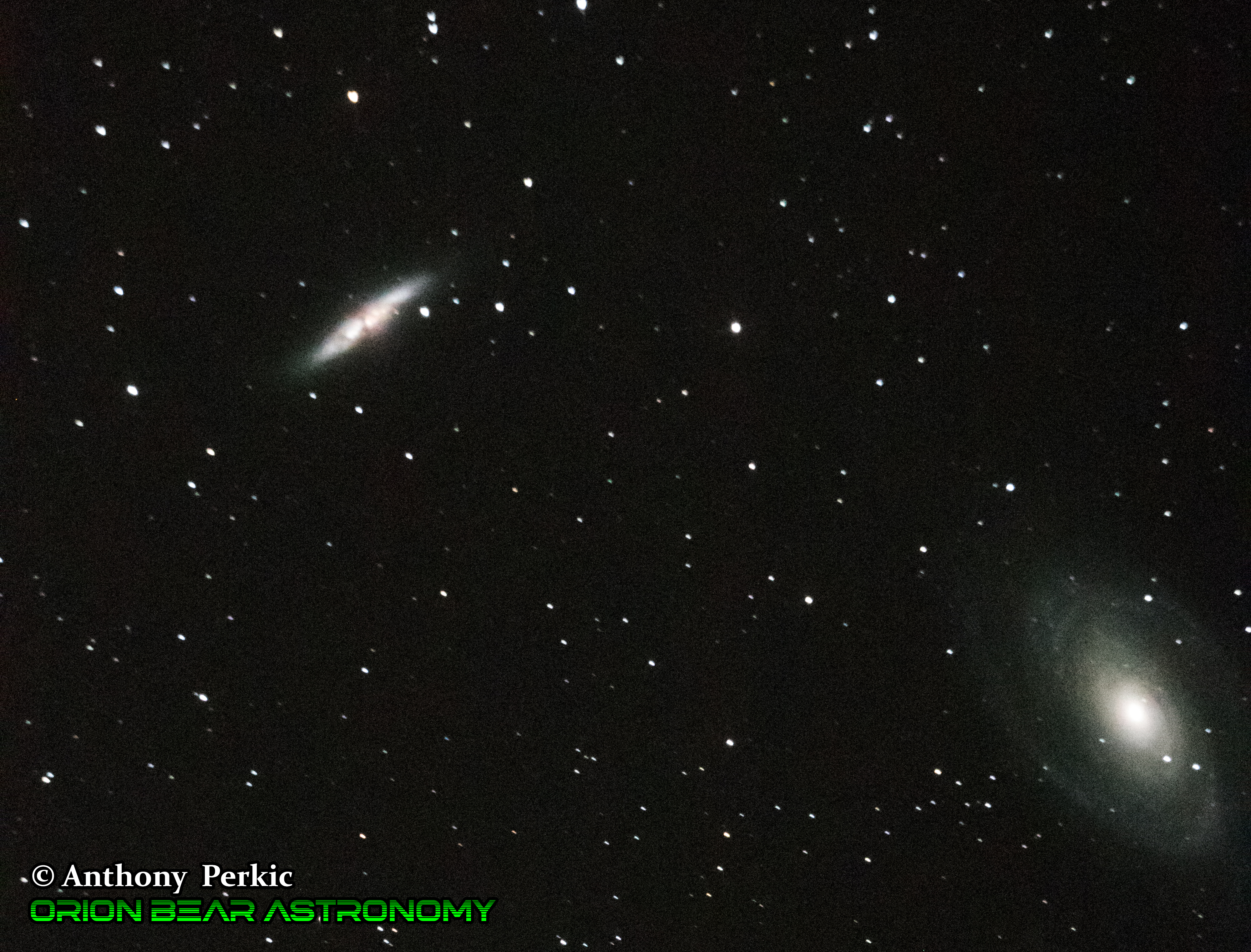 My first “jab” at the Leo Triplet, which is super noisy due to the high ISO I was shooting with. I was more happy that “hey, I got the target, and it looks like three galaxies… awesome! The field rotation due to not so accurate polar alignment is evident here as well.