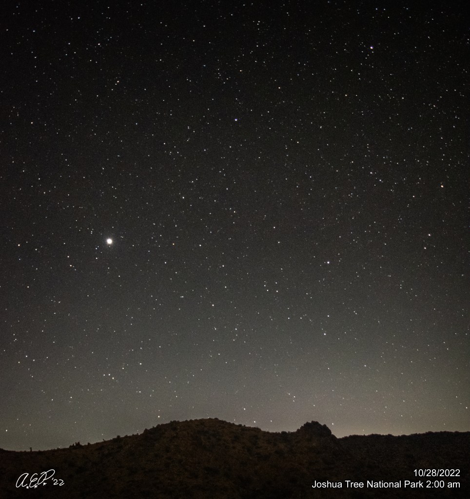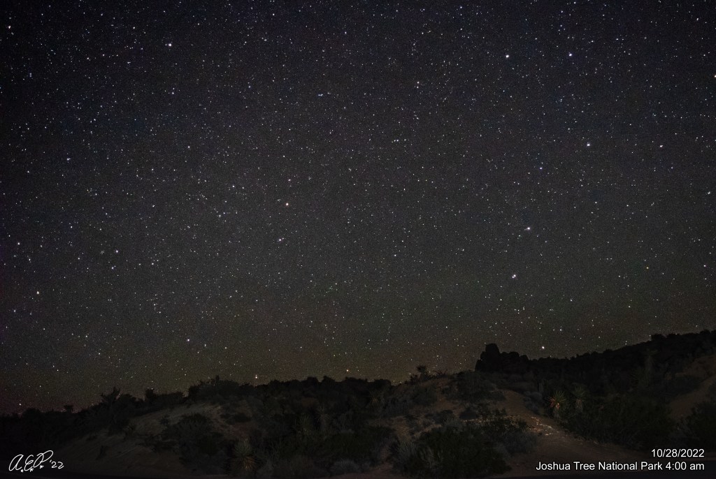 The fact of the matter is that after being burned out by possible predicted meteor storm that did not happen in late May, the summer of 2022 was not kind to this observer. With the amount of driving that I normally had to do over the summer for work, the stupid high gas prices, poor weather, and bad timing each new moon period meant I did not return to my usual imaging spot in Joshua Tree National Park until October!