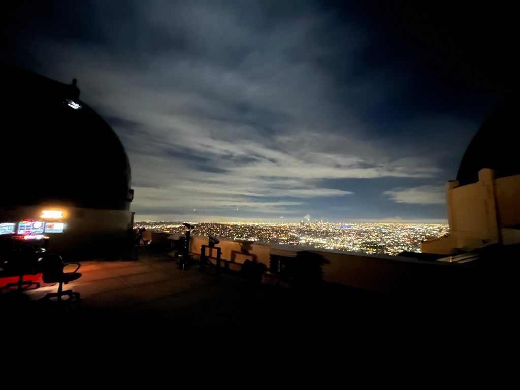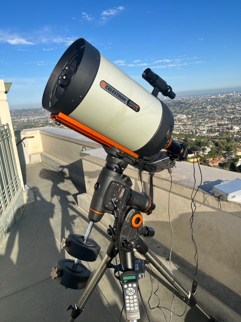 I literally drove to the observatory in the rain only to arrive and see the clouds clear up over Los Angeles and see all of us on the broadcast team stunned at the major break in the clouds. We were still thinking of rain in mind, and rather than set up the historic Zeiss telescope, it was decided that setting up the C11 Edge was more practical and easier to cover up in the event of rain, rather than risking any water get on the “big telescope’s” 91 year old refractor lens or old equipment.