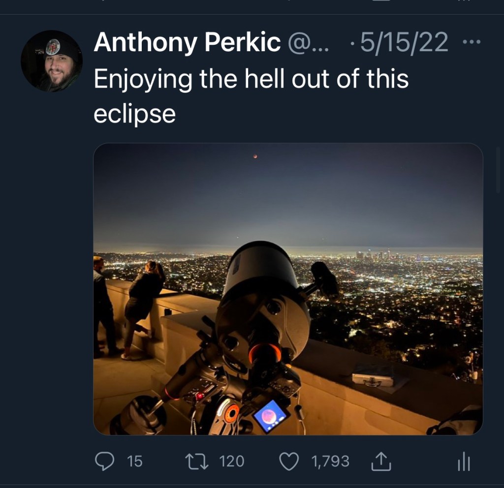 The eclipse itself was among the darkest I had seen in memory! Not only was the Flower Moon well within the central portion of earth’s shadow, but we noticed that to the naked eye, the moon during totality was rather hard to spot. As it turns out, we weren’t alone over Los Angeles, as it was reported to appear rather dark over places like Joshua Tree National Park where the skies weren’t tarnished by city lights. From one veteran observer I talked to, he told me it was probably the second darkest eclipse he’d ever seen… topped only by an eclipse that occurred after Mt. Pinatubo’s eruption that caused a lot of high atmospheric ash to settle and darken the moon. We believed that we were experiencing a similar effect caused by the Tonga eruption that happened 5 months earlier.