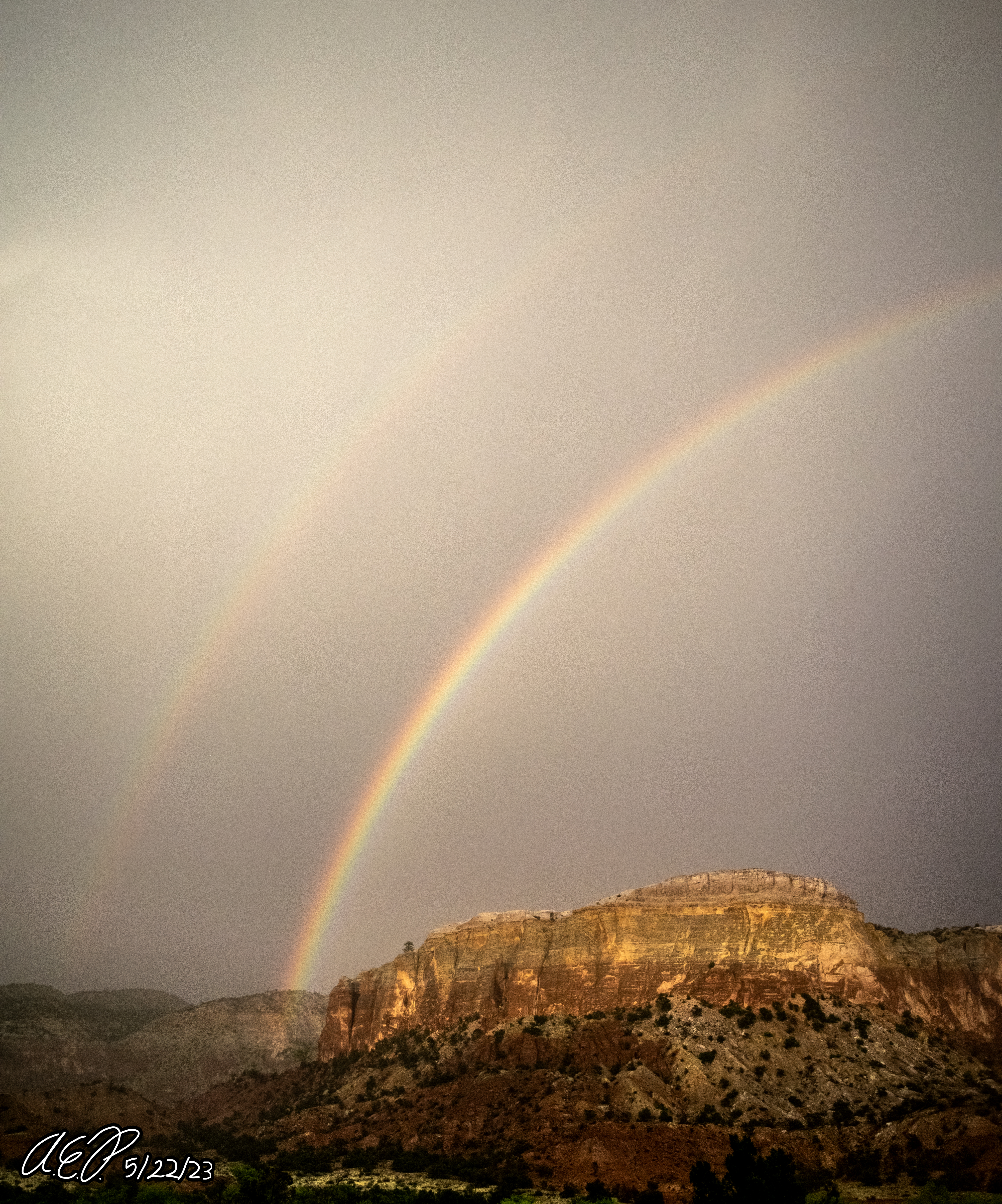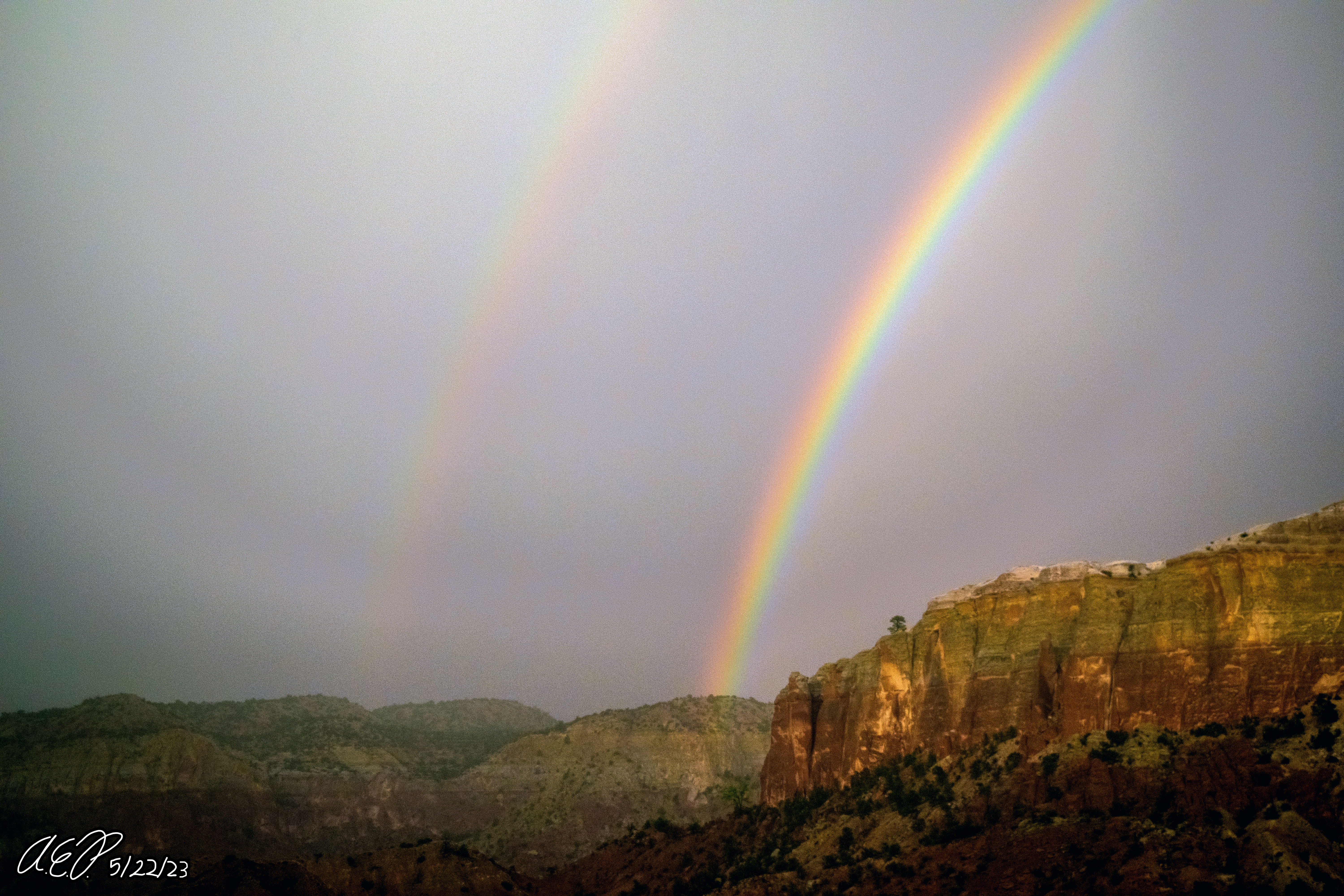 The passing thunderstorm ended up producing a really nice double rainbow, that fully arced across the eastern cliffs.