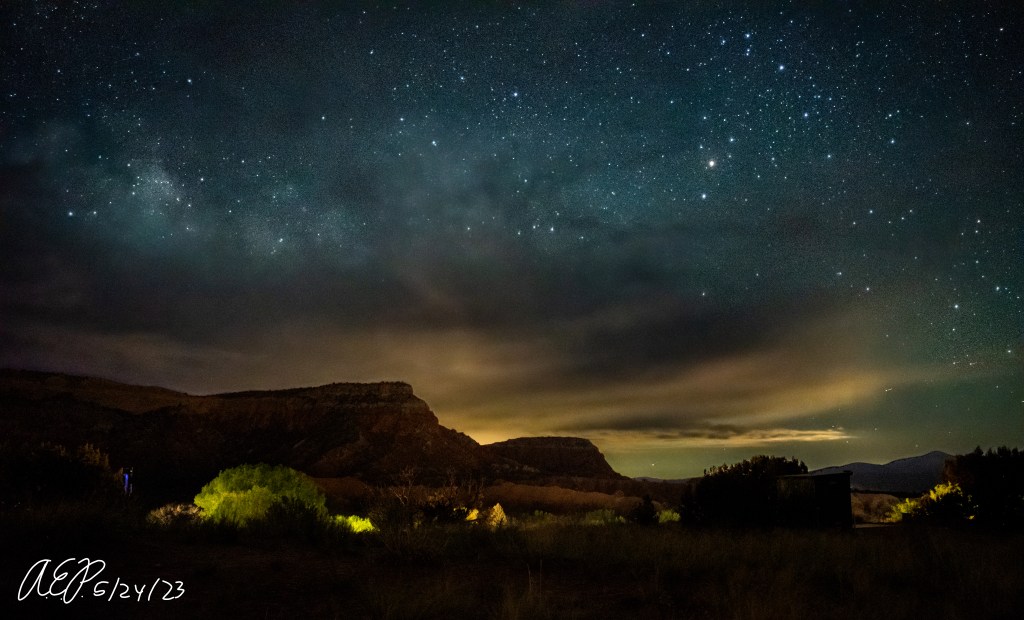 Upon arriving Monday afternoon, St. Johns Hiking Group welcomed me with open arms. Thanks to their generosity, I even had my own room. Because the Ghost Ranch staff showed us how to turn off the outdoor lights at our lodge, that meant I could simply set up near my room and enjoy the dark skies without having to drive nor transport anywhere upon finish…. and just simply crawl into bed. Such a nice break from my usual trips!
