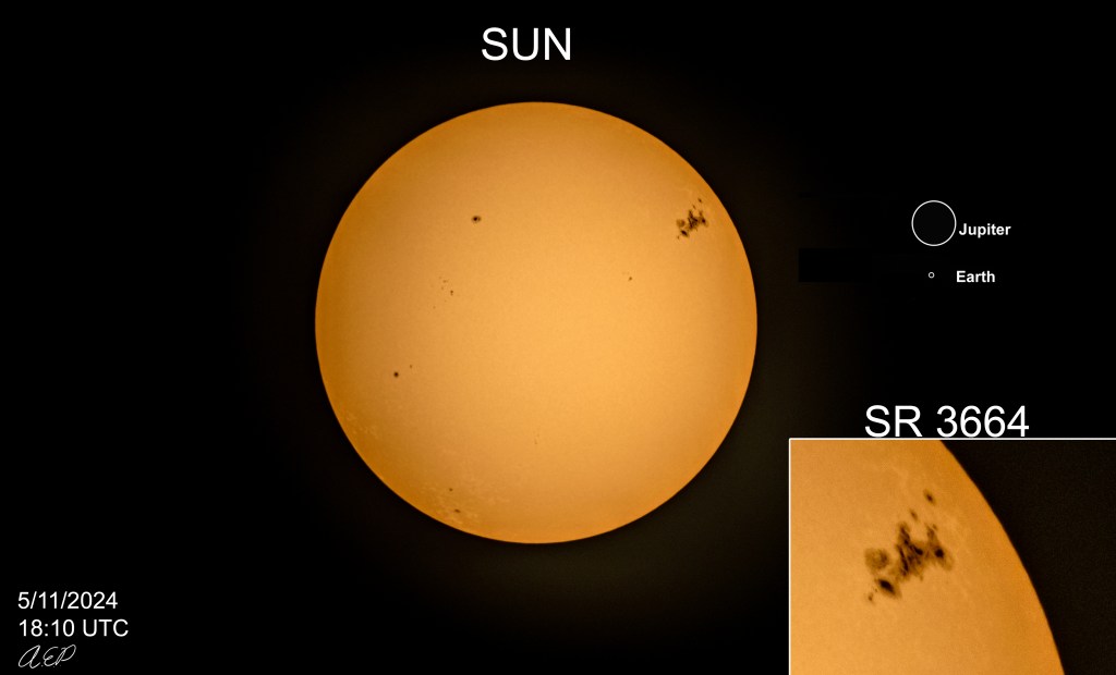 The Sun on May 11, 2024. Featured is the large sunspot region known as SR 3664, where the large flares and CME’s responsible for the Aurorae emanated from a few days prior.