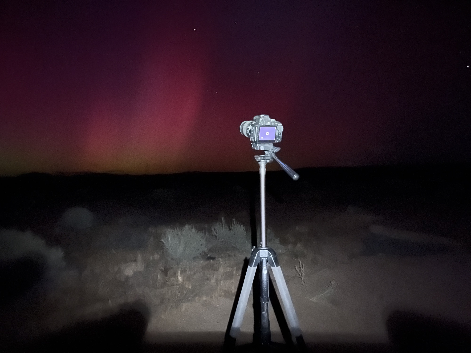 I chose a spot along US-395 north of Kramer Junction because all I needed was the sky to be absent of city lights to the north – distant lights to the south were not going to bug me too much. About an hour before I arrived, a fellow ‘gazer friend of mine in Colorado posted his pictures on social showing the aurora visible over Colorado, around the 40th latitude parrallel. One thing that I noticed was that from his vantage point, the aurora wasn’t just confined to the north, it was creeping over the southern constellations too! So I thought “then maybe from the 35th parallel, it’ll be a decent showing, perhaps.”