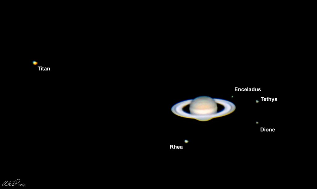 Jupiter w/ Io’s Shadow and GRS 8/25/21 2:30 amJupiter w/ Europa (left) 8/25/21 11:27pm Jupiter w/ Europa (left) and Ganymede (right) 8/25/21 11:55 pmSaturn w/moons 8/5/2021Saturn w/ labeled moons 8/25/2021